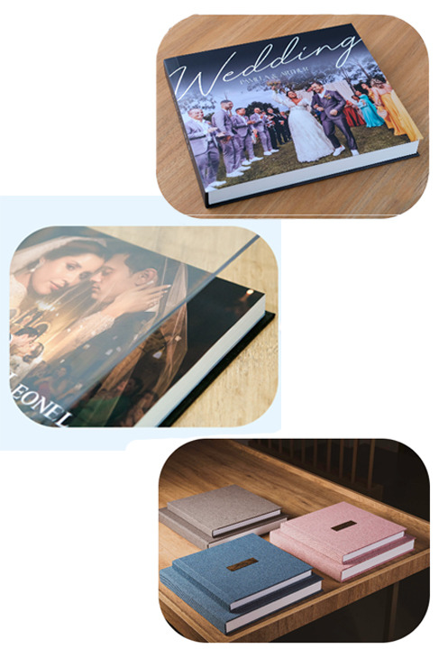 A partir dele, oferecemos diversos outros modelos, formatos, tamanhos, texturas e acabamentos, que iremos apresentar após o seu casamento, para que possam escolher o álbum que melhor represente e rememore de forma especial o dia do casamento de vocês.
