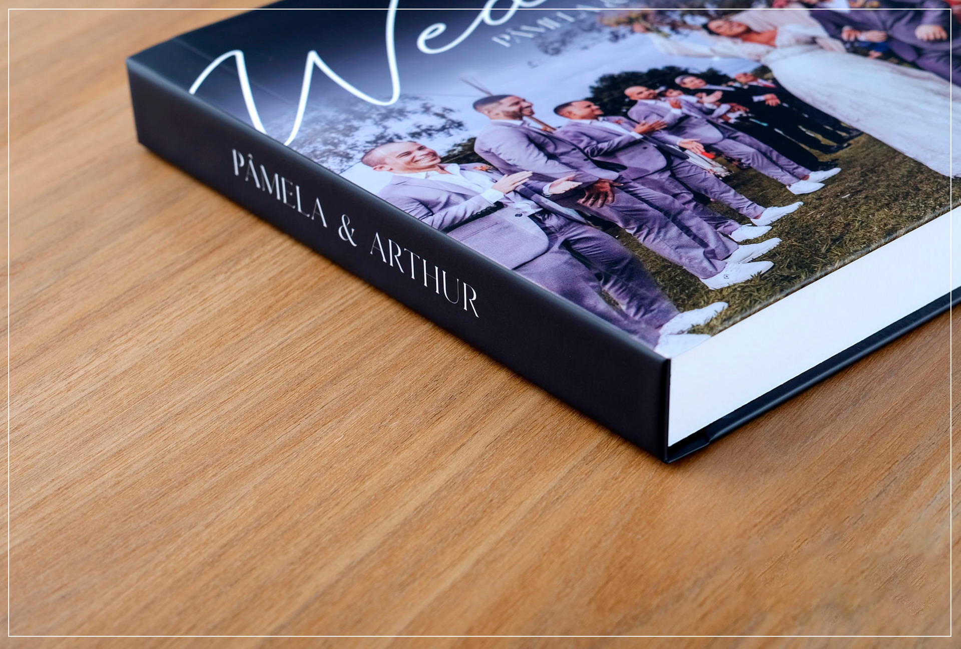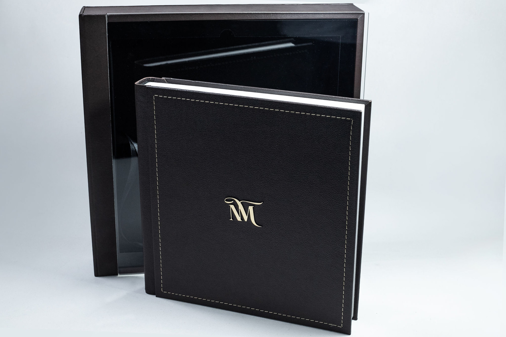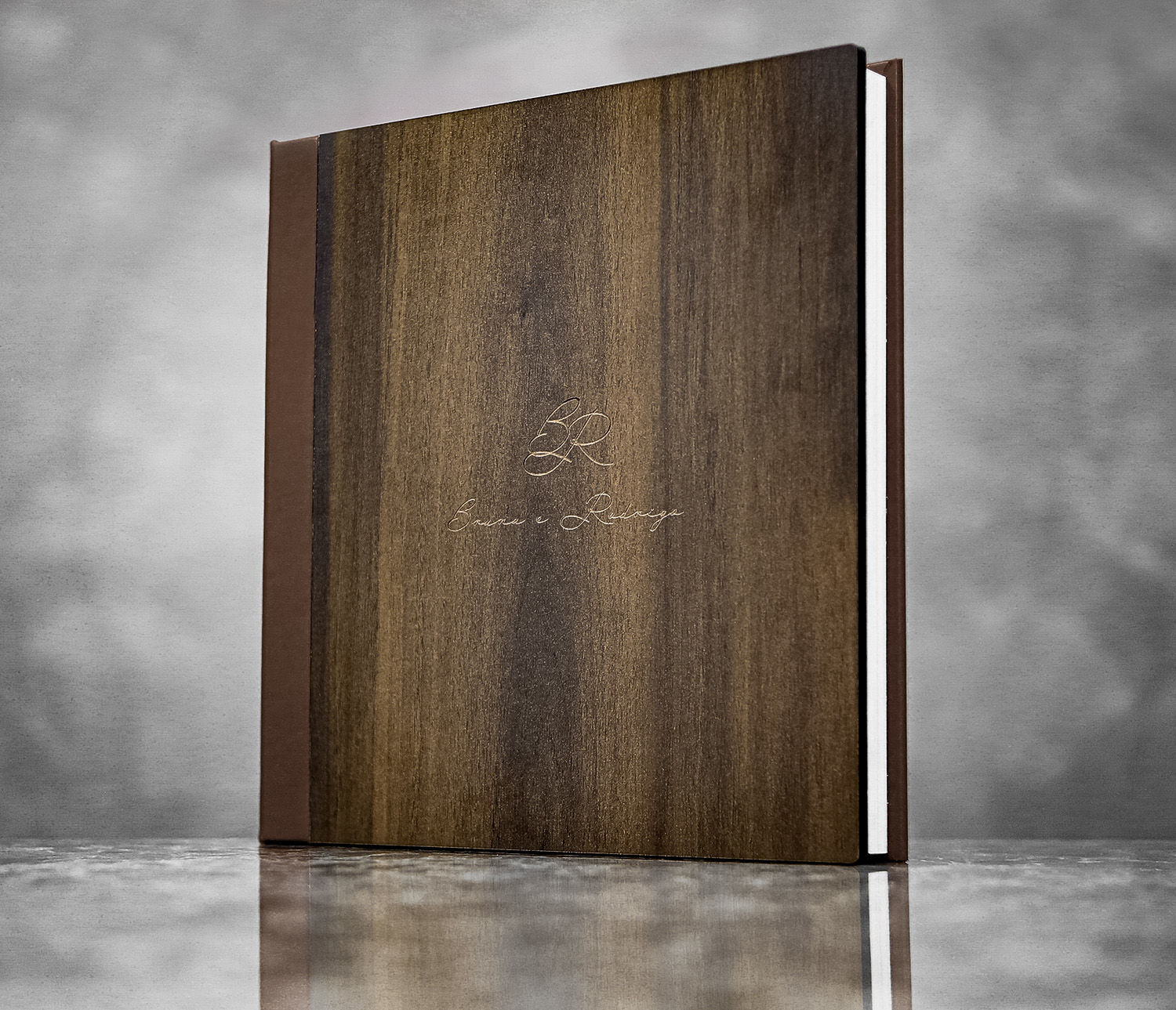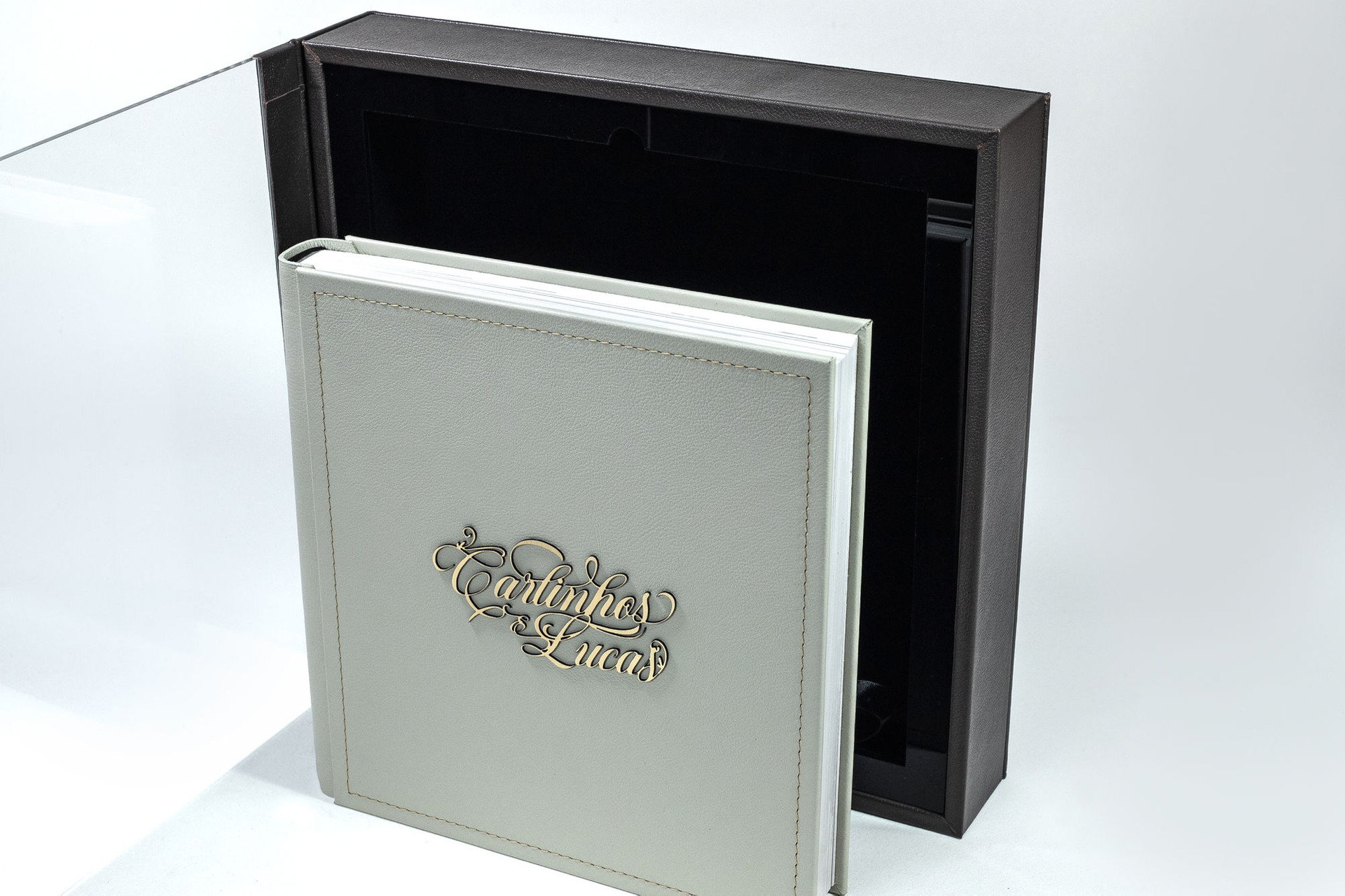 Album com capa em madeira MDF e dorso e verso revestido em courino.