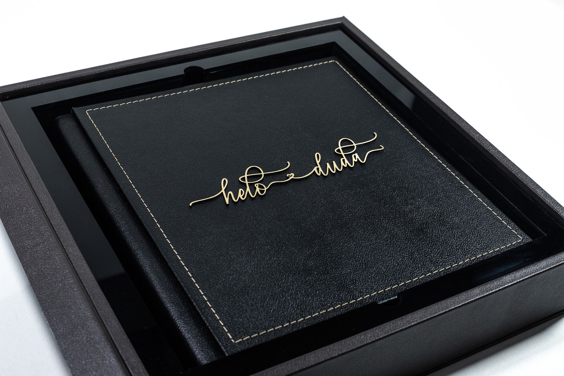 Álbum em Couro legítimo, costurado na cor bege, acrílico black e cristal